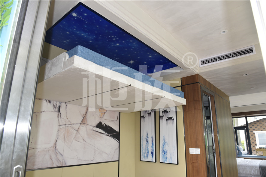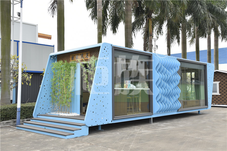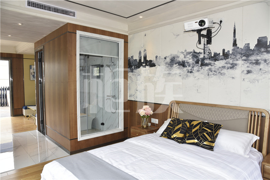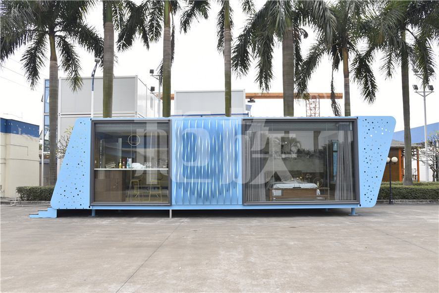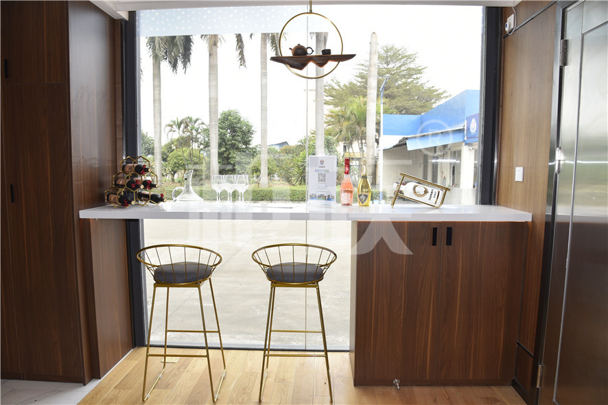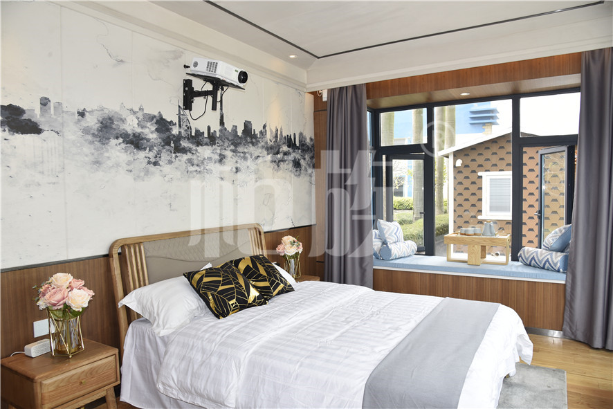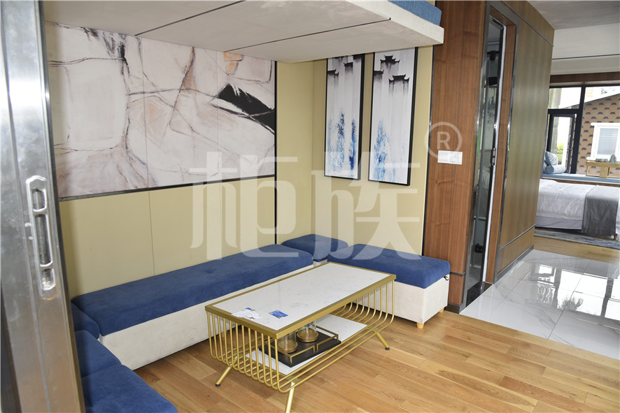 功能布局:入戶臺(tái)階,箱子整體抬高,前廳設(shè)吧臺(tái)和茶幾,樓面為隱藏式升降床,中部為衣柜、洗手臺(tái)及衛(wèi)生間,臥室內(nèi)帶飄窗陽(yáng)臺(tái),配影音系統(tǒng)。大面積落地玻璃窗,適合觀景。設(shè)計(jì)用途為景區(qū)特色民宿。